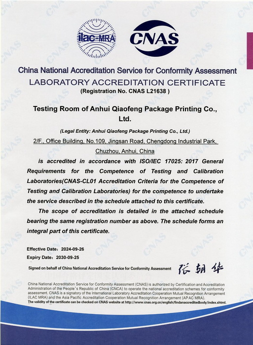 Anhui Qiaofeng Packaging and Printing Co., Ltd Tel:0550-2172798 Fax: 0550-2172828 E-MAIL: 847108076@qq.com Company address: No. 109, Nanjing Road, Chengdong Industrial Park, Chuzhou City Website: http://www.ahqfbz.com