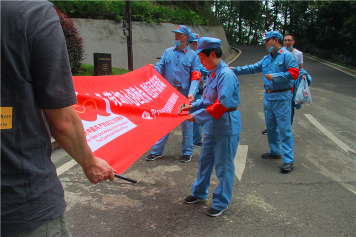 第二天的行程中,党员们“挺进”大别山——游览天堂寨风景区。天堂寨所处的大别山,最高峰海拔1729.13米,为大别山主峰之一。据导游介绍,徒步爬到山峰需要3个小时以上。当天的天堂寨还下着大雨,在这种恶劣的天气条件下,党员们受到革命先辈精神的鼓舞,由陶总、沈主席和宁总助等公司领导带头,大家纷纷放弃乘坐缆车,冒雨徒步登山。登山途中,有崎岖小路,有陡峭岩壁,但党员们一路携手同行、互帮互助、不畏困难、攀登险阻,终于在汗水与雨水中到达顶峰,此时大家更加深切地感受到当年刘邓大军行军的艰辛与不易。