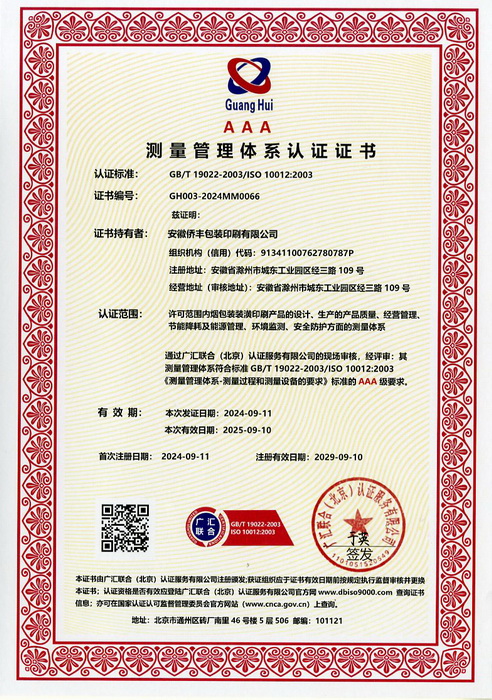 2024年9月11日,公司荣获测量管理体系认证证书。