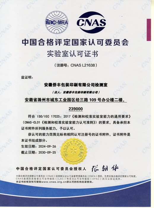 2024年9月26日,公司荣获中国合格评定国家认可委员会实验室认可证书(CNAS证书)。