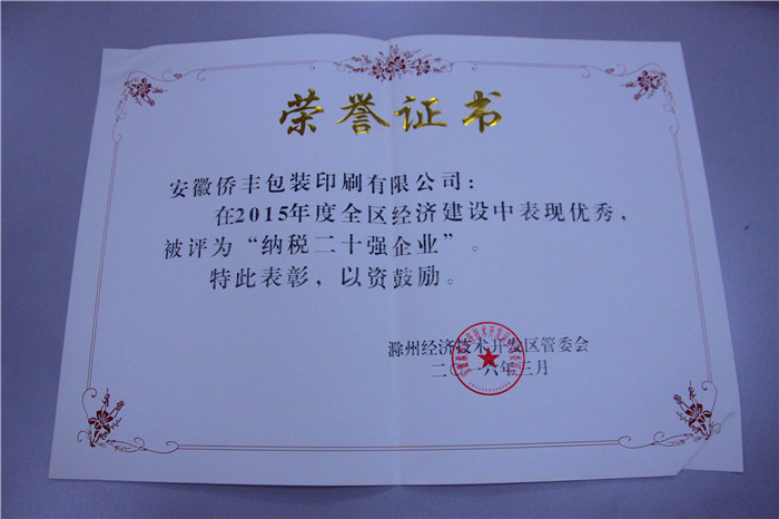 安徽侨丰包装印刷有限公司2015年获奖证书